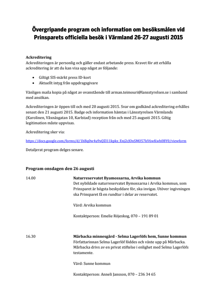 Övergripande program, ackreditering och information om besöksmålen vid Prinsparets officiella besök i Värmland 26-27 augusti 2015.