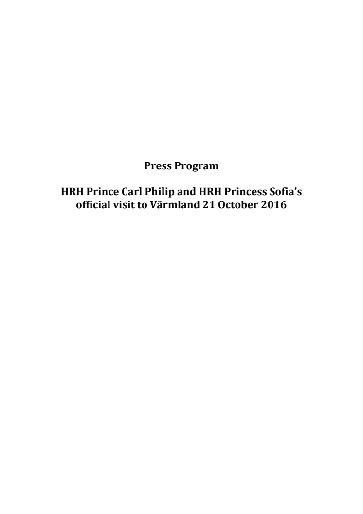 Press program for HRH Prince Carl Philip and HRH Princess Sofia’s official visit to Värmland 21 October 2016