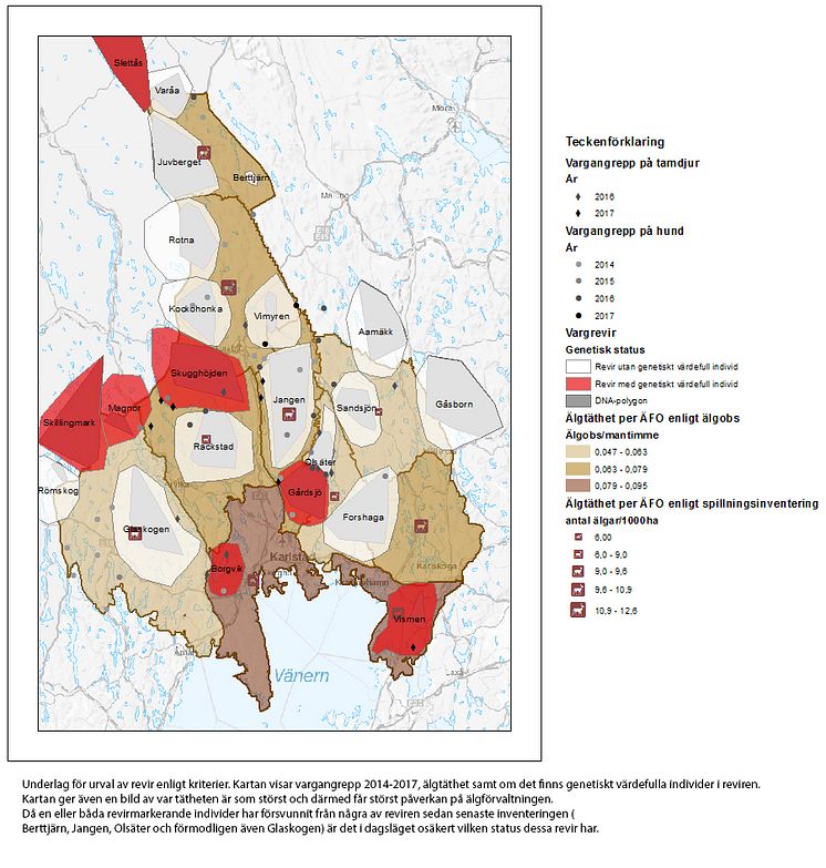Underlag för urval av revir enligt kriterier. Kartan visar vargangrepp 2014-2017, älgtäthet samt om det finns genetiskt värdefulla individer i reviren.