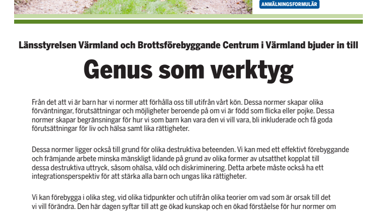 Länsstyrelsen Värmland och Brottsförebyggande Centrum i Värmland bjuder in till konferensen genus som verktyg. Den här dagen syftar till att ge ökad kunskap och en ökad förståelse för hur normer om maskulinitet och femininitet, det vill säga genus, kan sättas in i ett förebyggande sammanhang.
