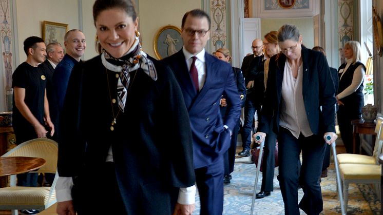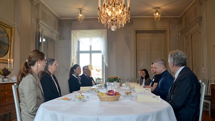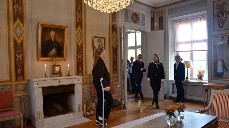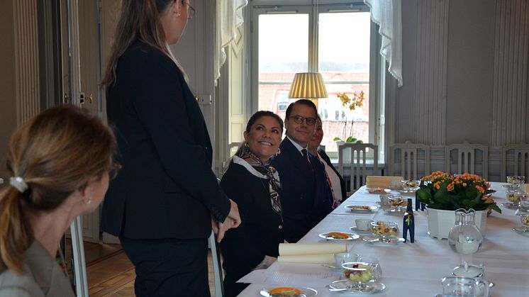 T.f. landshövding Camilla Fagerberg Littorin tar emot kronprinsessparet. Kronprinsessparet på väg in i landshövdingens residens där de ska bjudas på frukost. T.f. landshövding Camilla Fagerberg Littorin, som är värd för besöket, hälsar kronprinsessparet välkomna och introducerar gästerna som ska dela med sig av sina erfarenheter. Linus Sandgren, koncernsäkerhetschef på Clas Ohlson, delar med sig av erfarenheter kring hur Coronapandemin påverkat verksamheten och vad man ser framåt. Bakom Linus sitter även två ungdomar som driver lyckade UF-företag i Dalarna. Ibrahim Khodabash som jobbar med film och foto, och Tania Gazi som driver podden "Inte min svaghet".Kronprinsessparet åt frukost med t.f. landshövding Camilla Fagerberg Littorin, Linus Sandgren, koncernsäkerhetschef på Clas Ohlson, Thomas Agneteg - ansvarig för Ung Företagsamhet i Dalarna, samt de två gymnasieeleverna Tania Gazi och Ibrahim Khodabash som driver UF-företag.