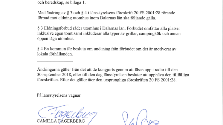 I och med det nya beslutet råder eldningsförbud utomhus i Dalarnas län. Förbudet omfattar alla platser inklusive egen tomt samt inkluderar alla typer av grillar, campingkök och annan öppen låga utomhus.