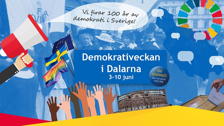 2021 är det exakt 100 år sedan det första demokratiska valet med allmän rösträtt genomfördes i Sverige och demokratin därmed fick sitt genombrott. För att fira demokratin detta jubileumsår arrangerar Länsstyrelsen i Dalarnas län Demokrativeckan i Dalarna, tillsammans med länets aktörer.