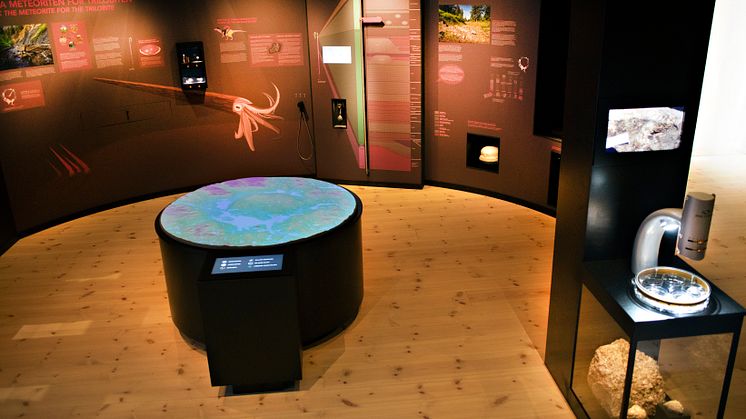 Med avstamp i meteoritnedslaget tar utställningen oss med på geologisk resa. Hur känns ett meteoritnedslag? Varför är kratern inte ett hål? Hur syns det i landskapet idag?