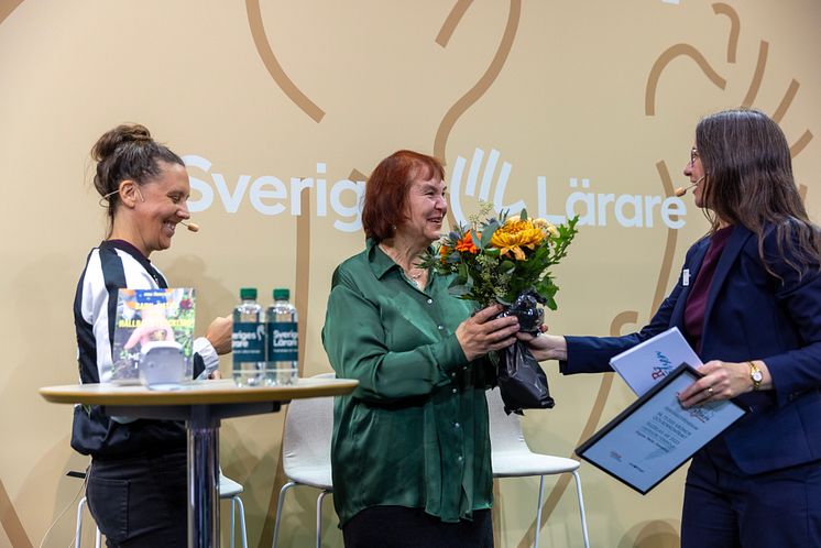 Förskollärare Signe Vats Jonsson, Årets Lärarförfattare 2025 i kategori förskola i mitten. T.h. Malin Tufvesson. T.v. förra årets pristagare Elin Larsson.