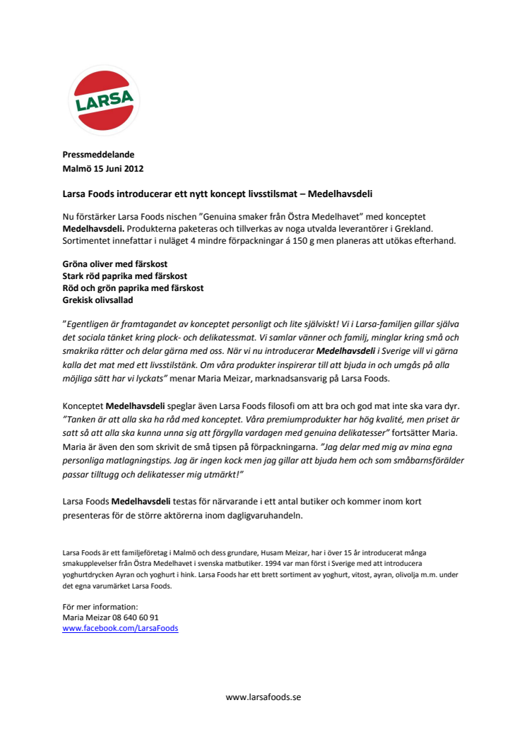 Nu förstärker Larsa Foods nischen ”Genuina smaker från Östra Medelhavet” med konceptet Medelhavsdeli. Produkterna paketeras och tillverkas av noga utvalda leverantörer i Grekland. Sortimentet innefattar i nuläget 4 mindre förpackningar á 150 g men planeras att utökas efterhand.