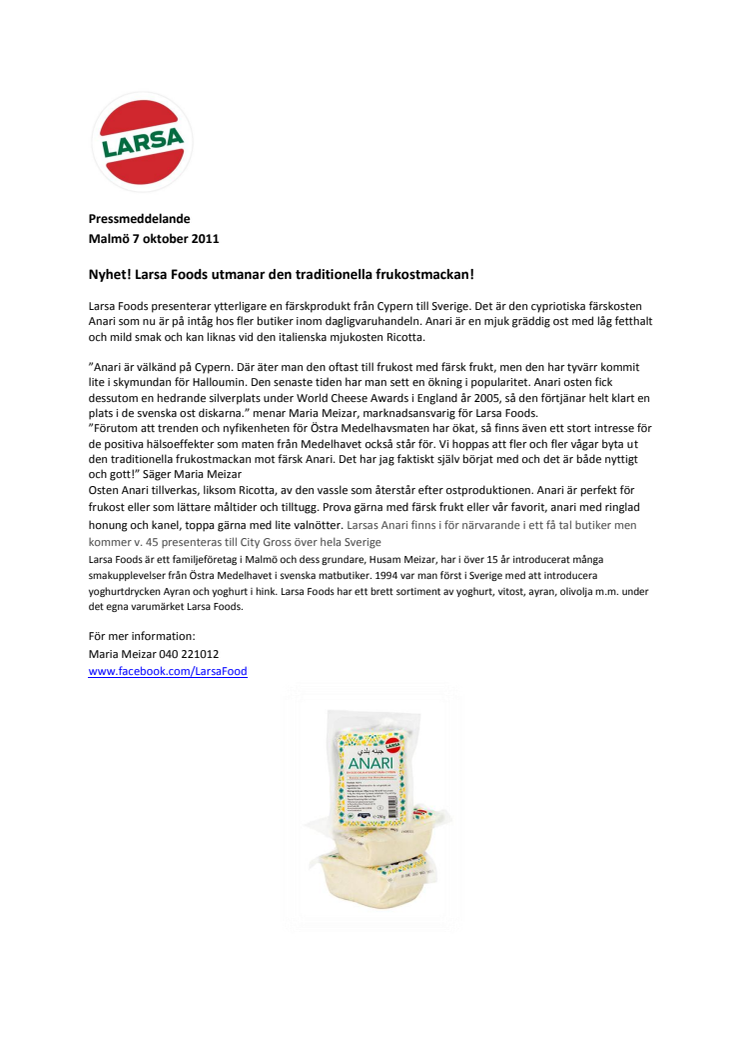 Larsa Foods presenterar ytterligare en färskprodukt från Cypern till Sverige. Det är färskosten Anari som nu är på intåg hos flera butiker inom dagligvaruhandeln. Anari är en mjuk gräddig ost med låg fetthalt och mild smak. Anari är perfekt för frukost eller som lättare måltider och tilltugg.