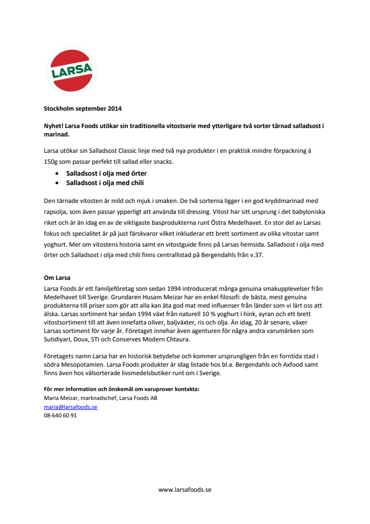 Nyhet! Larsa Foods utökar sin traditionella vitostserie med ytterligare två sorters tärnad salladsost i marinad.