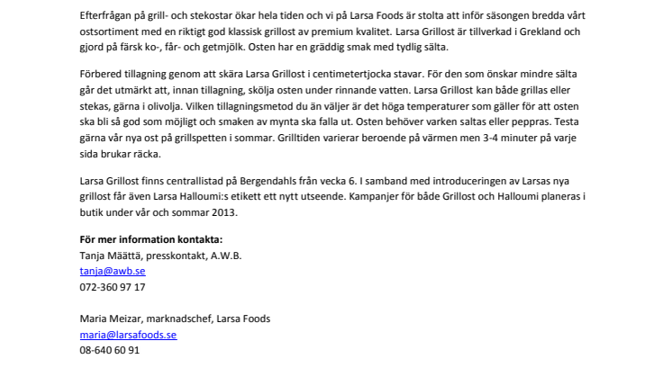 Larsa, vars fokus och specialitet ligger på vitostar och övriga färskvaror, introducerar ytterligare en vitost från Grekland inför vår och sommarsäsongen 2013. Salladsosten är lagrad i saltlake innan paketering. Smaken är mild och naturell. Osten är tillverkad av 100% pastöriserad komjölk och har en lättare syrlighet och sälta än Larsas grekiska feta från samma leverantör. Salladsosten passar ypperligt i en god sallad eller varför inte skära upp osten direkt på ett fat med olivolja och servera som sidorätt.Larsa Grekisk salladsost finns centarlistade på Bergendahls från vecka 6.