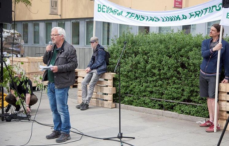 Arne Johansson från Norra Järva stadsdelsråd en av talarna på manifestationen som arrangerades av Initiativ Tensta /Låt Parken Leva