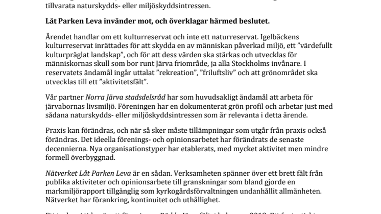 För att ha rätt att överklaga ett beslut om reservatstillstånd måste föreningen ha till huvudsakligt ändamål att tillvarata naturskydds- eller miljöskyddsintressen, varit verksam i tre år och ha minst 100 medlemmar. Länstyrelsen anser inte att Norra Järva stadsdelsråd har som huvudändamål att tillvarata miljöskyddsintressen, och Låt Parken Leva uppfyller inte minimikraven för en ideell förening. Det räcker inte med 1450 följare på facebook anser Länsstyrelsen, det bör även finnas ett konstituerande möte och stadgar.