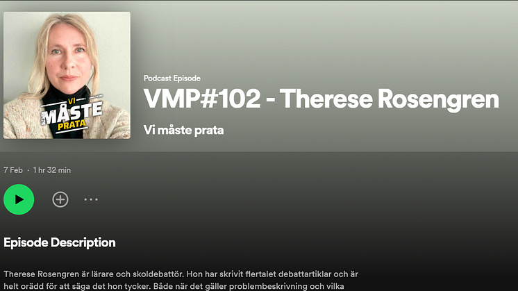Författaren, läraren och skoldebattören Therese Rosengren delar med sig i podcasten "Vi Måste Prata" om sin bok "De otillräkneliga" och tar upp frågor som segregation, språkproblem och utmaningarna för skolpersonalen i en miljö av våld och otrygghet. I podcasten diskuterar hon även hur dessa faktorer skapar en grogrund för den växande gängkriminaliteten vi ser idag samt hennes egna erfarenheter som lärare och skoldebattör. Rosengren berättar även om vad som inspirerade henne att skriva "De otillräkneliga".
