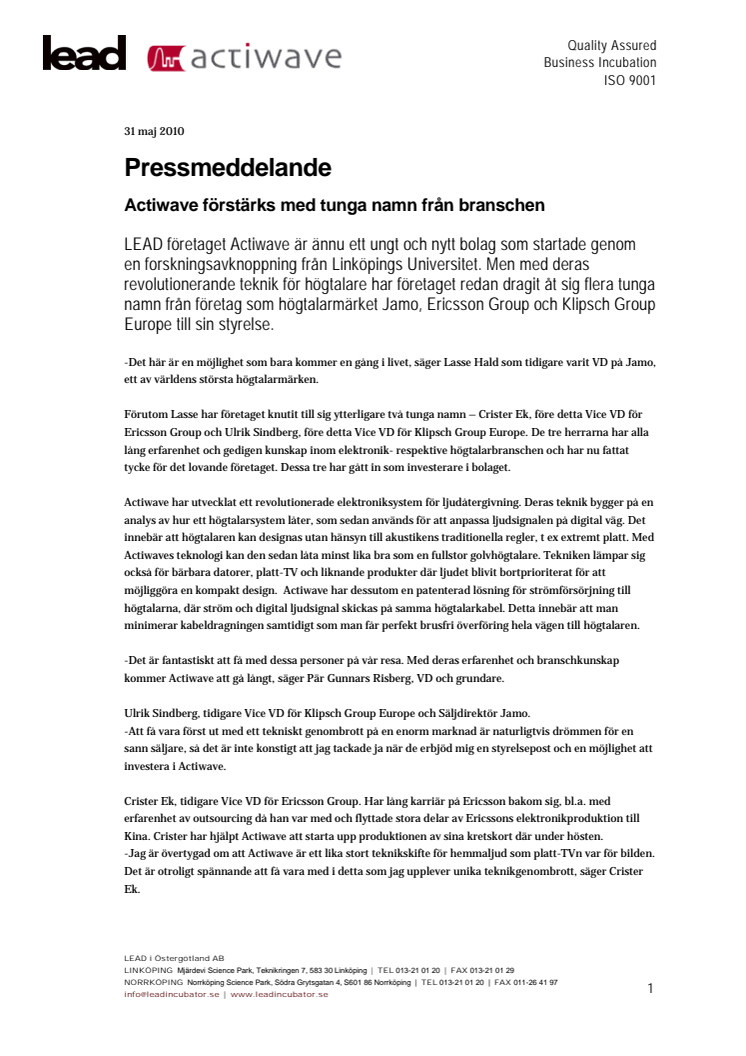LEAD företaget Actiwave är ännu ett ungt och nytt bolag som startade genom en forskningsavknoppning från Linköpings Universitet. Men med deras revolutionerande teknik för högtalare har företaget redan dragit åt sig flera tunga namn från företag som högtalarmärket Jamo, Ericsson Group och Klipsch Group Europe till sin styrelse.