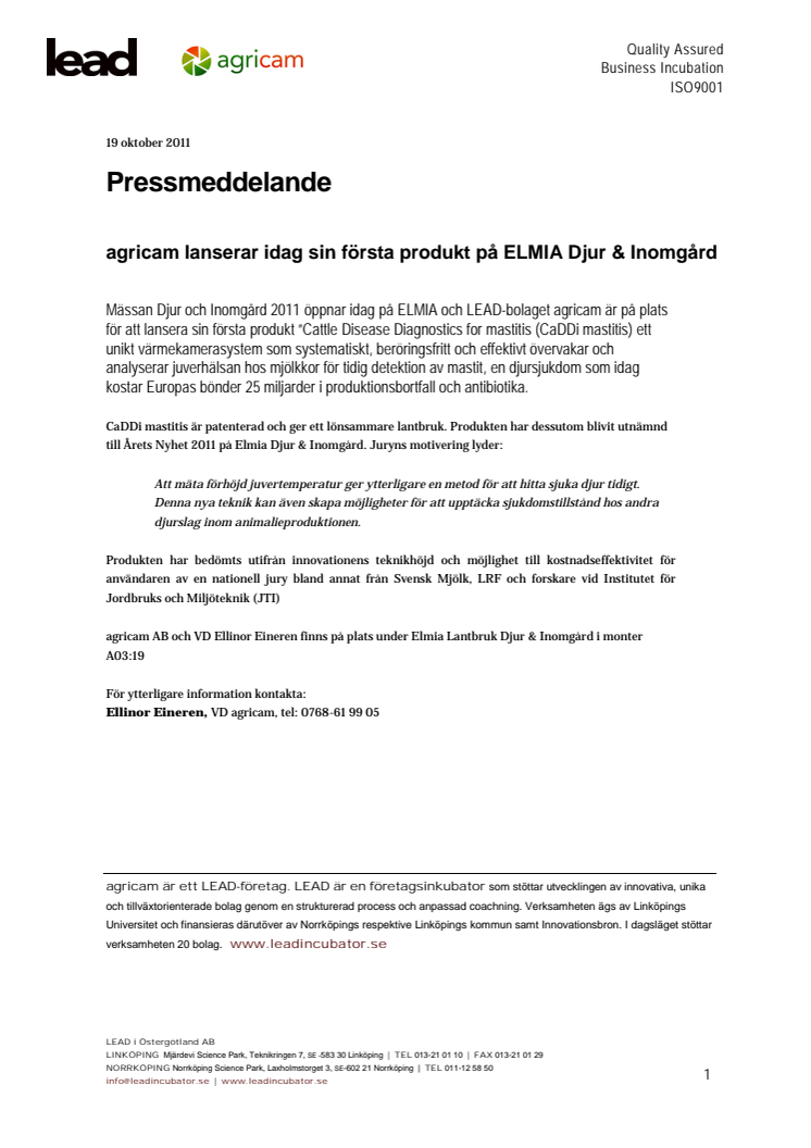 Mässan Djur & Inomgård 2011 öppnar idag på ELMIA och LEAD-bolaget agricam är på plats för att lansera sin första produkt ”Cattle Disease Diagnostics for mastitis (CaDDi mastitis) ett unikt värmekamerasystem som övervakar & analyserar juverhälsan hos mjölkkor för tidig detektion av mastit, en sjukdom som idag kostar Europas bönder 25 miljarder kronor årligen i produktionsbortfall och antibiotika.