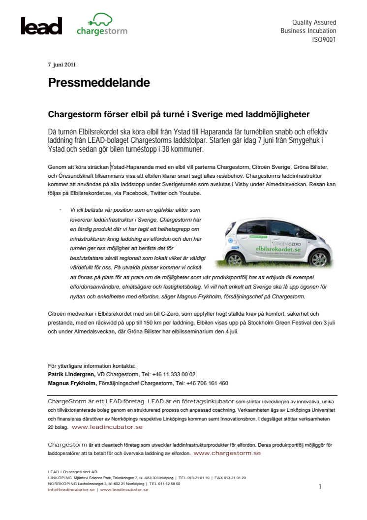 Då turnén Elbilsrekordet ska köra elbil från Ystad till Haparanda får turnébilen snabb och effektiv laddning från LEAD-bolaget Chargestorms laddstolpar. Starten går idag 7 juni från Smygehuk i Ystad och sedan gör bilen turnéstopp i 38 kommuner.