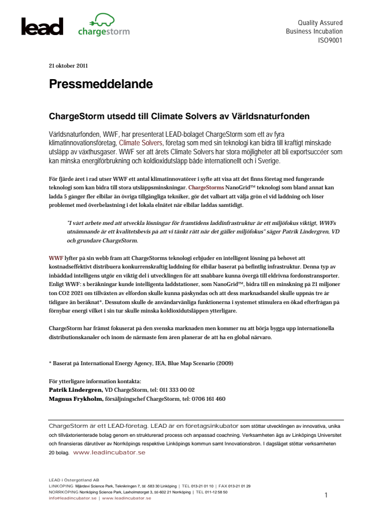 Världsnaturfonden, WWF, har presenterat LEAD-bolaget ChargeStorm som ett av fyra klimatinnovationsföretag, Climate Solvers, företag som med sin teknologi kan bidra till kraftigt minskade utsläpp av växthusgaser. WWF ser att årets Climate Solvers har stora möjligheter att bli exportsuccéer som kan minska energiförbrukning och koldioxidutsläpp både internationellt och i Sverige.
