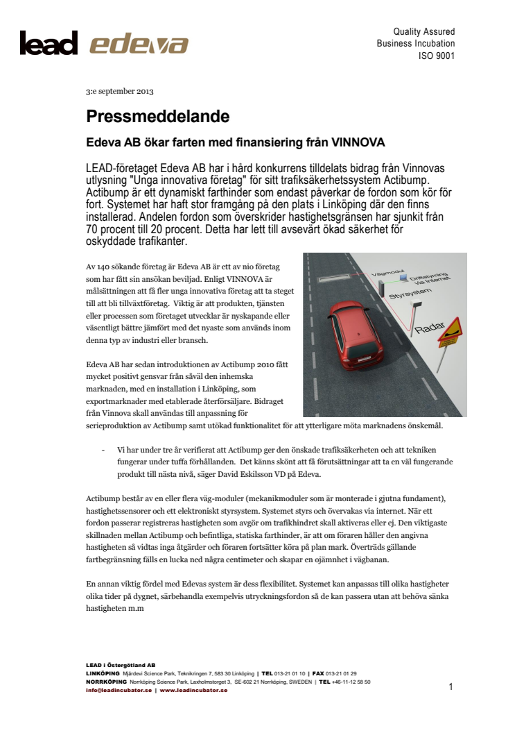 Edeva AB har i hård konkurrens tilldelats bidrag från Vinnovas utlysning "Unga innovativa företag" för sitt trafiksäkerhetssystem Actibump. Actibump är ett dynamiskt farthinder som endast påverkar de fordon som kör för fort. Systemet har haft stor framgång på den plats i Linköping där den finns installerad. Andelen fordon som överskrider hastighetsgränsen har sjunkit från 70 % till 20 %.