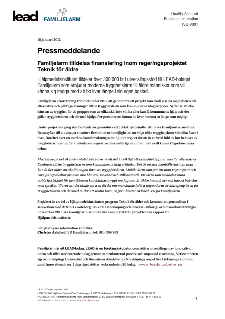Hjälpmedelsinstitutet tilldelar över 300 000 kr i utvecklingsstöd till LEAD-bolaget Familjelarm som erbjuder moderna trygghetslarm till äldre människor som vill känna sig trygga med att bo kvar längre i sin egen bostad.