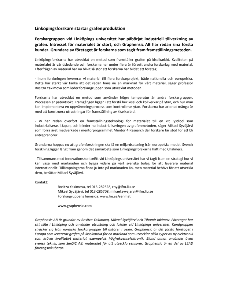 Linköpingsforskarna har utvecklat en metod som framställer grafen på kiselkarbid. Kvaliteten på materialet är världsledande och forskarna har under flera år försett andra forskarlag med material.Efterfrågan av material har nu blivit så stor att forskarna har bildat ett företag, Graphensic. Bolaget är en del av företagsinkubatorn LEAD.