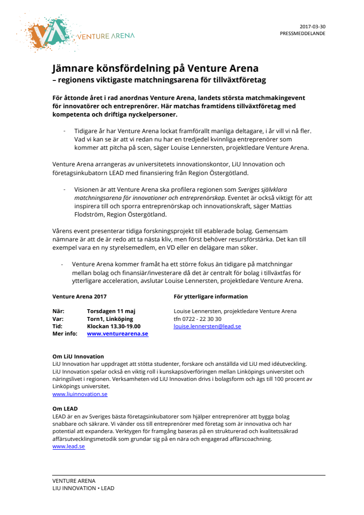 För åttonde året i rad anordnas Venture Arena, landets största matchmakingevent för innovatörer och entreprenörer. Här matchas framtidens tillväxtföretag med kompetenta och driftiga nyckelpersoner. Venture Arena 2017, arrangeras den 11 maj på Torn1 i Linköping, mellan klockan 13.30-19.00.