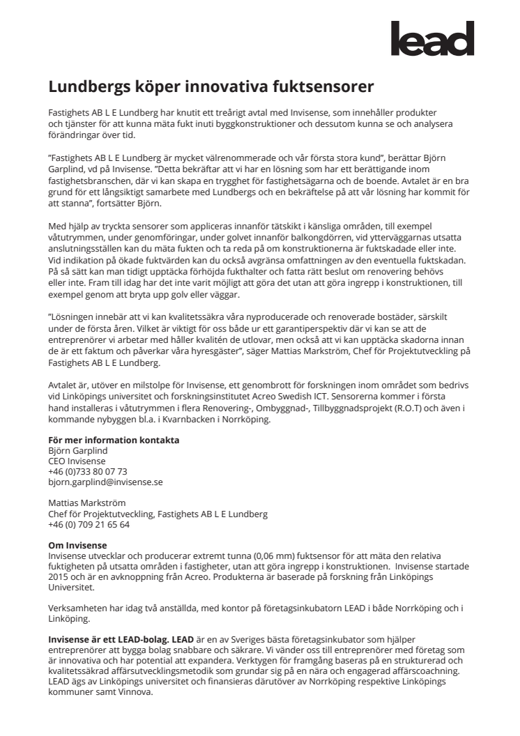 Fastighets AB L E Lundberg har knutit ett treårigt avtal med Invisense, som innehåller produkter och tjänster för att kunna mäta fukt inuti byggkonstruktioner och dessutom kunna se och analysera förändringar över tid.
