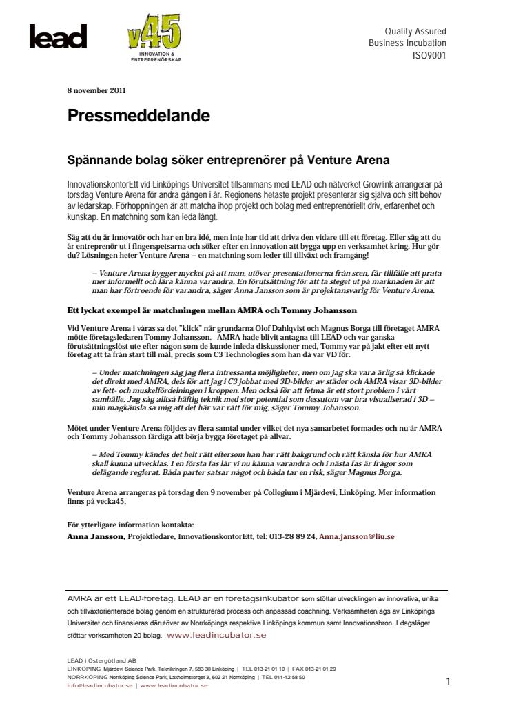 InnovationskontorEtt vid Linköpings Universitet tillsammans med LEAD och nätverket Growlink arrangerar på torsdag Venture Arena för andra gången i år. Regionens hetaste projekt presenterar sig själva och sitt behov av ledarskap. Förhoppningen är att matcha ihop projekt och bolag med entreprenöriellt driv, erfarenhet och kunskap. En matchning som kan leda långt.