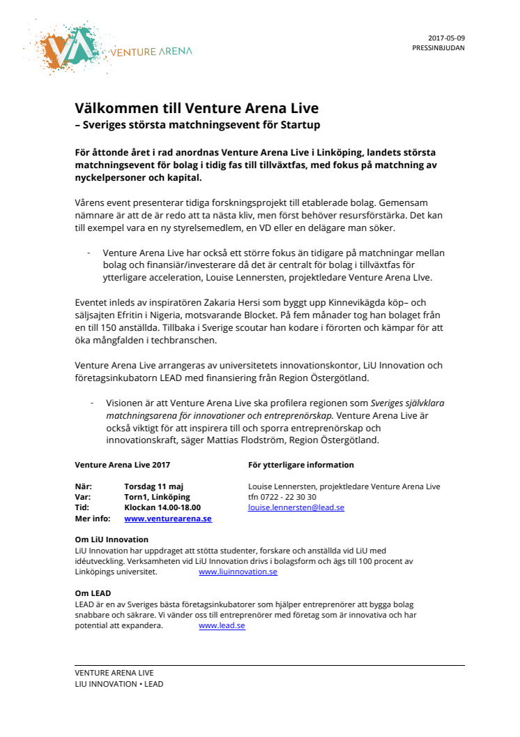 För åttonde året i rad anordnas Venture Arena Live i Linköping, landets största matchningsevent för bolag i tidig fas till tillväxtfas, med fokus på matchning av nyckelpersoner och kapital.