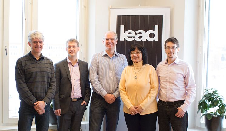 På bilden från vänster: Tomas Larson, affärscoach på LEAD, Jonas Nilsson, Styrelseordförande Graphensic, Lars Bentsson, affärscoach på LEAD, Rositza Yakimova, en av grundarna till Graphensic, Mikael Syväjärvi, en av grundrana till Graphensic