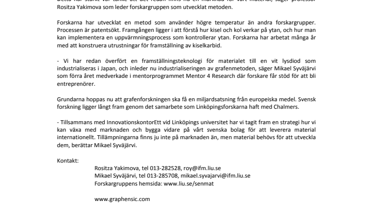 Linköpingsforskarna har utvecklat en metod som framställer grafen på kiselkarbid. Kvaliteten på materialet är världsledande och forskarna har under flera år försett andra forskarlag med material. Efterfrågan av material har nu blivit så stor att forskarna har bildat ett företag, Graphensic. Bolaget är en del av företagsinkubatorn LEAD.