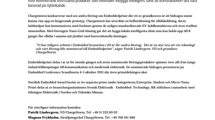 "Vi har tidigare arbetat i Embedded branschen i 20 år för andra företag. Det är en stor ära att vår teknologi och vårt företag blir nominerad till Embeddedpriset", säger Patrik Lindergren, VD och grundare, ChargeStorm.