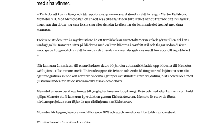 – Tänk dig att kunna fånga och återuppleva varje minnesvärd stund av ditt liv, säger Martin Källström, Memotos VD. Med Memoto kan du enkelt resa tillbaka i tiden till tillfället när du träffade ditt livs kärlek, dagen när din dotter tog sina första steg eller den där kvällen när du bara hade det trevligt med dina kompisar.