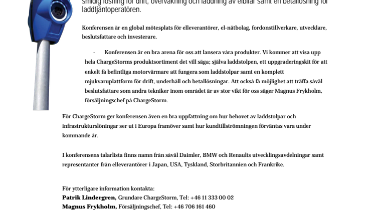 - Konferensen är en bra arena för oss att lansera våra produkter. Vi kommer att visa upp hela ChargeStorms produktsortiment det vill säga; själva laddstolpen, ett uppgraderingskit för att enkelt få befintliga motorvärmare att fungera som laddstolpar samt en komplett mjukvaruplattform för drift, underhåll och betallösningar. Att också få möjlighet att träffa såväl beslutsfattare som andra tekniker inom området är av stor vikt för oss säger Magnus Frykholm, försäljningschef på ChargeStorm.