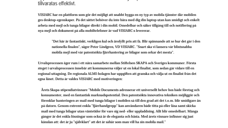 "Det här är fantastiskt, verkligen kul och ärofyllt pris att få. Blir spännande att se hur det går i den nationella finalen", säger Peter Lindgren, VD VISIARC. "Snart ska vi lansera vår blixtsnabba mobila mejl med vår patentsökta fjärrhantering av bilagor som orkar det mesta".
