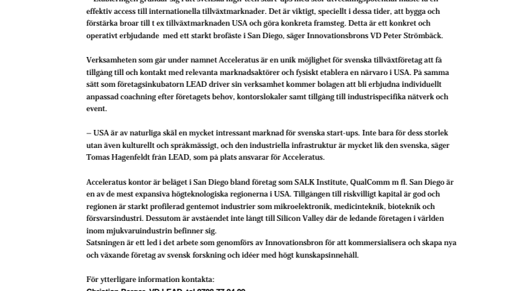 På initiativ av Innovationsbron, i samarbete med Vinnova och den svenska företagsinkubatorn LEAD, startas en verksamhet i San Diego, USA som syftar till att etablera och accelerera svenska high-tech start-ups på den amerikanska marknaden