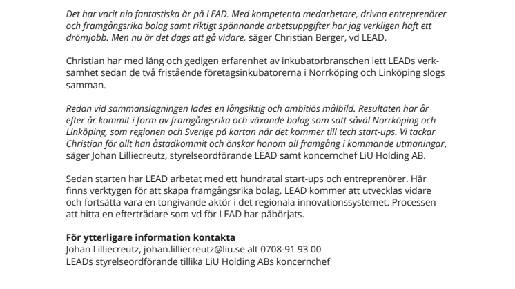 "Redan vid sammanslagningen lades en långsiktig och ambitiös målbild. Resultaten har år efter år kommit i form av framgångsrika och växande bolag som satt såväl Norrköping och Linköping, som regionen och Sverige på kartan när det kommer till tech start-ups. Vi tackar Christian för allt han åstadkommit och önskar honom all framgång i kommande utmaningar", sägerJohan Lilliecreutz, styrelseordförande LEAD samt koncernchef LiU Holding AB.