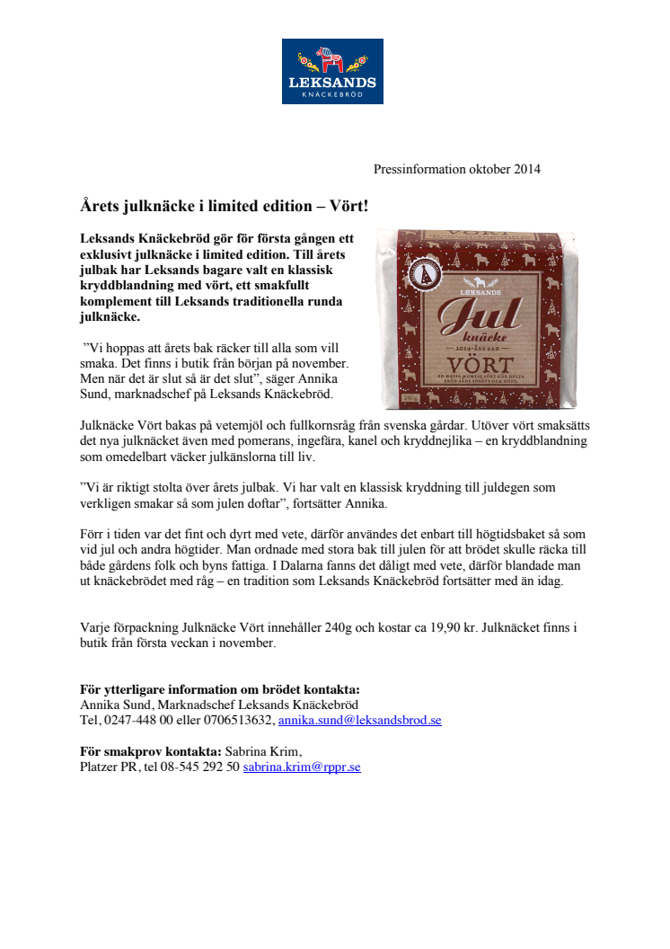 Leksands Knäckebröd gör för första gången ett exklusivt julknäcke i limited edition. Till årets julbak har Leksands bagare valt en klassisk kryddblandning med vört, ett smakfullt komplement till Leksands traditionella runda julknäcke.