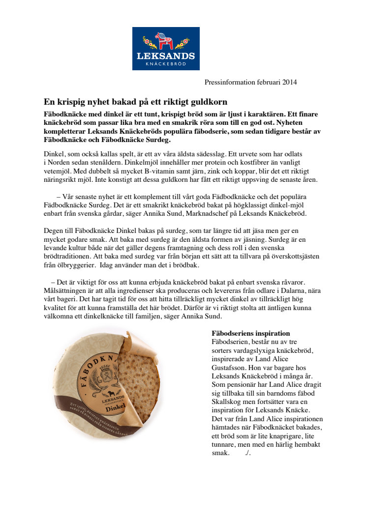 Fäbodknäcke med dinkel är ett tunt, krispigt bröd som är ljust i karaktären. Ett finare knäckebröd som passar lika bra med en smakrik röra som till en god ost. Nyheten kompletterar Leksands Knäckebröds populära fäbodserie, som sedan tidigare består av Fäbodknäcke och Fäbodknäcke Surdeg.