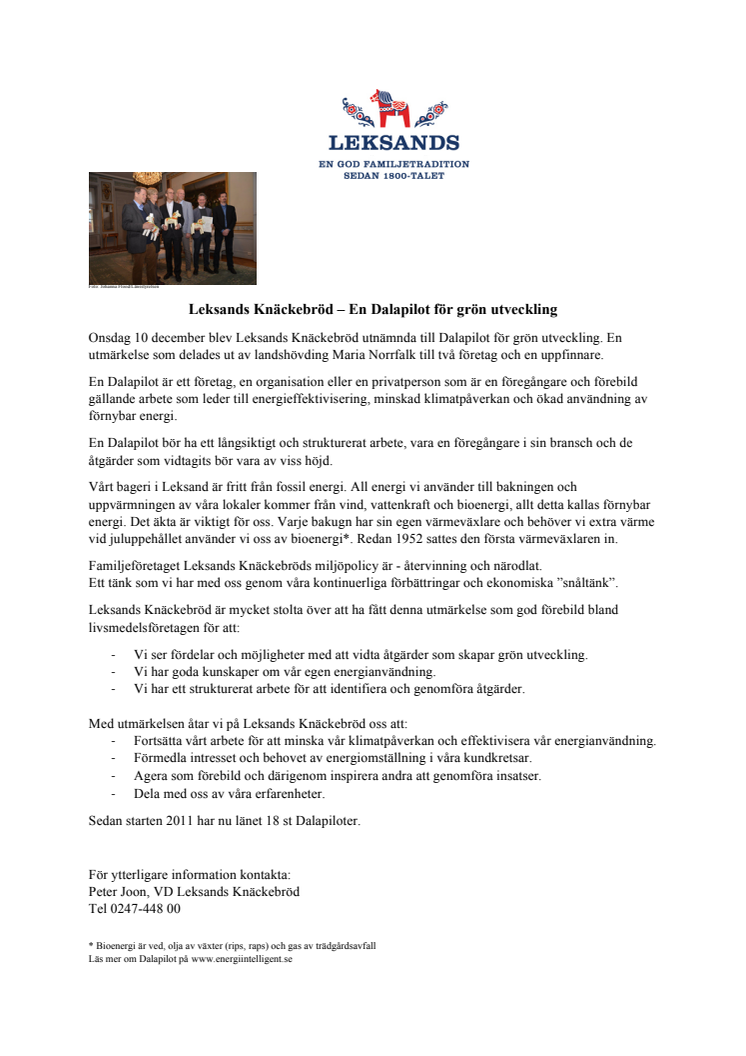 Onsdag 10 december blev Leksands Knäckebröd utnämnda till Dalapilot för grön utveckling. En