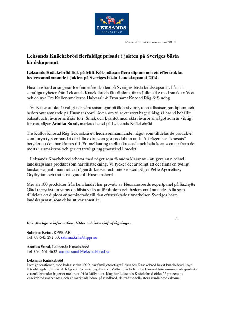 Leksands Knäckebröd fick på Mitt Kök-mässan flera diplom och ett eftertraktat hedersomnämnande i Jakten på Sveriges bästa Landskapsmat 2014.