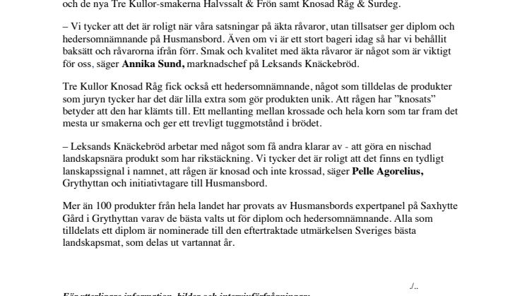 Husmansbord arrangerar för femte året Jakten på Sveriges bästa landskapsmat. I år har samtliga nyheter från Leksands Knäckebröds fått diplom, årets Julknäcke med smak av Vört och de nya Tre Kullor-smakerna Halvssalt & Frön samt Knosad Råg & Surdeg.