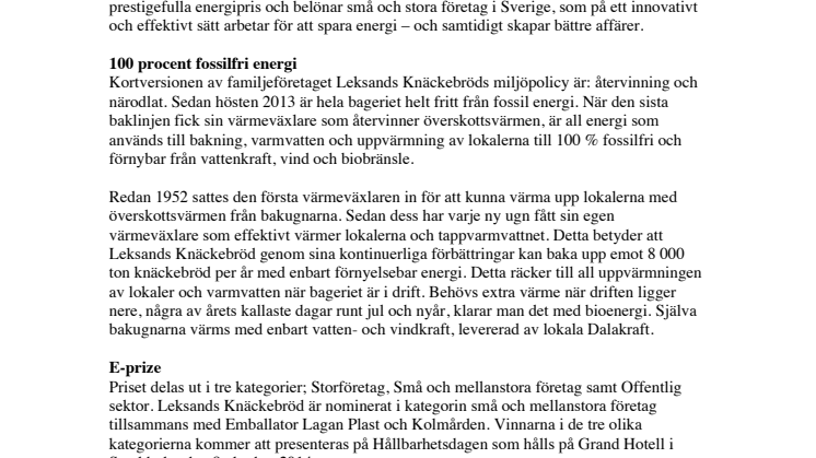 Leksands Knäckebröd är nominerat till E-Prize, ett pris som Veckans Affärer och E.ON tilldelar företag i Sverige som aktivt arbetar med sin energieffektivisering. Leksands Knäckebröd, som sedan 2013 är helt fossilfria, är ett gott exempel på vad engagemang och långsiktig planering kan göra för både ekonomi och miljö.
