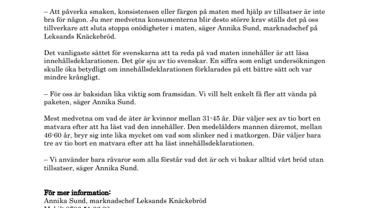 – Att påverka smaken, konsistensen eller färgen på maten med hjälp av tillsatser är inte bra för någon. Ju mer medvetna konsumenterna blir desto större krav ställs det på oss tillverkare att sluta stoppa onödigheter i maten, säger Annika Sund, marknadschef på Leksands Knäckebröd.