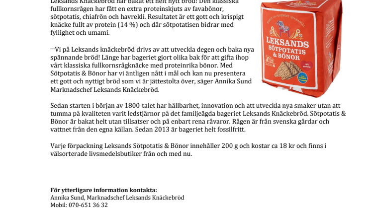 ─Vi på Leksands knäckebröd drivs av att utveckla degen och baka nya spännande bröd! Länge har bageriet gjort olika bak för att gifta ihop vårt klassiska fullkornsrågknäcke med proteinrika bönor. Med Sötpotatis & Bönor har vi äntligen nått i mål och kan nu presentera ett gott och nyttigt bröd som vi är jättestolta över, säger Annika Sund Marknadschef Leksands Knäckebröd.