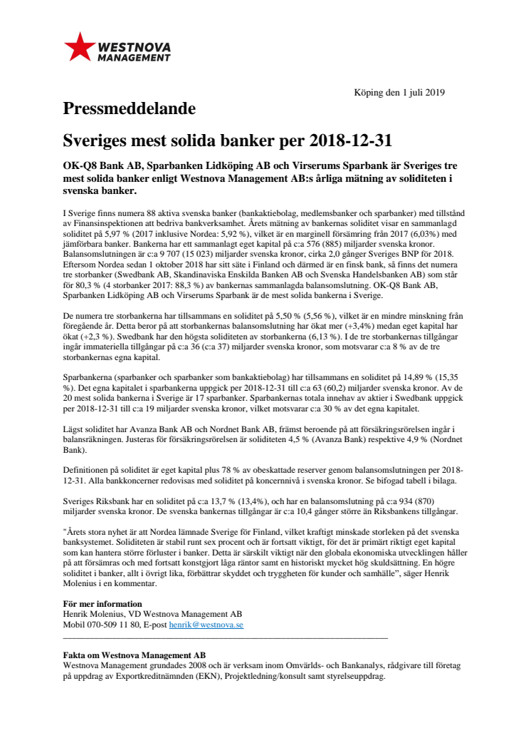 Pressmeddelande Westnova Management AB Soliditet i svenska banker 2018-12-31