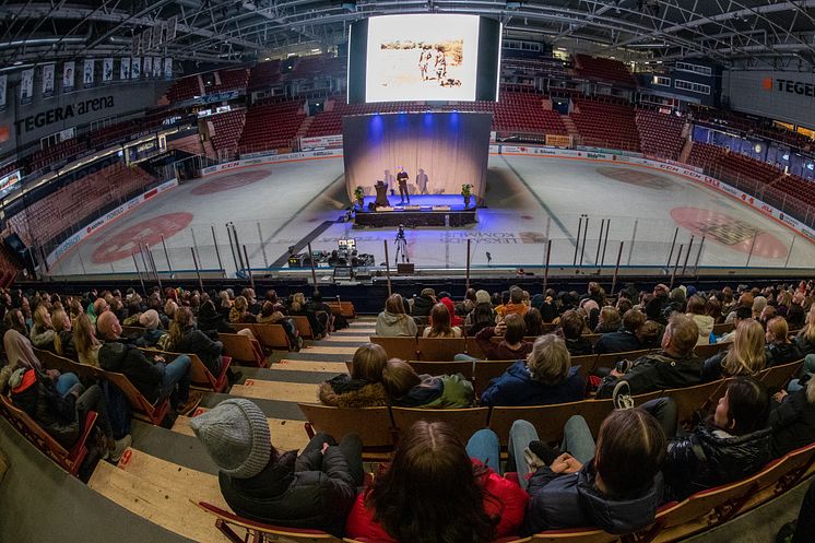 Anders Hansen föreläser inför 4500 skolelever, lärare, anhöriga och kunder till Leksands Sparbank i Tegera Arena.