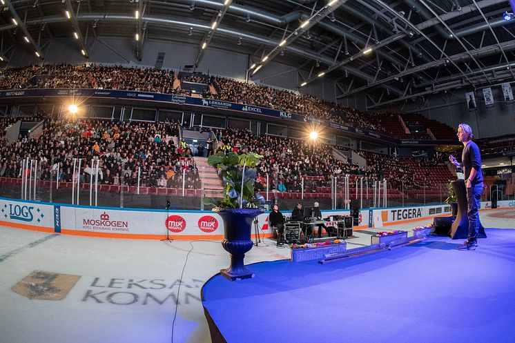 Anders Hansen föreläser inför 4500 skolelever, lärare, anhöriga och kunder till Leksands Sparbank i Tegera Arena.
