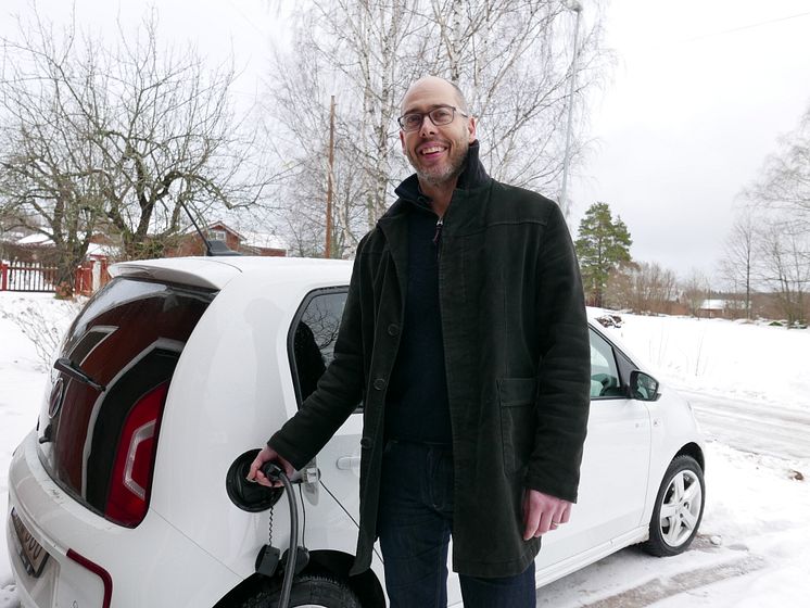Pelle Sjögren sätter elbilen på laddning. En av tjänsterna som företaget Garagekoll utvecklar är Laddkoll, en tjänst för att företag och andra organisationer ska kunna erbjuda elbilsladdning till kunder, anställda och allmänheten och samtidigt tjäna pengar eller finansiera kostnaden för laddstolparna.