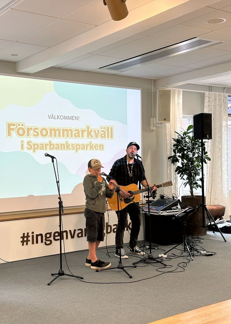 Stiko Per Larsson uppträder under Försommarkväll i Sparbanksparken, vid utdelningen av hållbarhetspriset Årets Virvelvind. Här på scen tillsammans med sonen Pelle.
