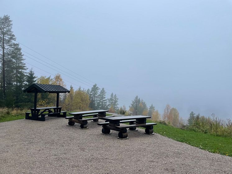 Fina dagar är det en vidunderlig utsikt över Siljansbygden från Åsledsbergets topp, faktiskt ända upp till Sälen. Men den här dagen när Leksands Sparbank hälsar på Britten Calles och Karin Östman från bystugeföreningen ligger dimman tät uppe på toppen.