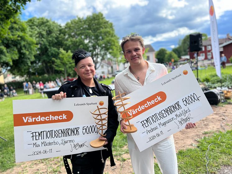 Det var välfyllt i Sparbanksparken i Leksand under tisdagskvällen, när sommaren skulle firas med både musik och prisutdelning. Stiko Per Larsson bjöd på sång, musik och anekdoter från scen och när det sen var dags att avslöja vinnarna fick han sällskap på scen av Sparbankens vd Björn Rinstad, som läste upp juryns motiveringar till de två vinnarna: Andreas Magnusson från Mockfjärd och Mia Mästerbo från Djurmo.